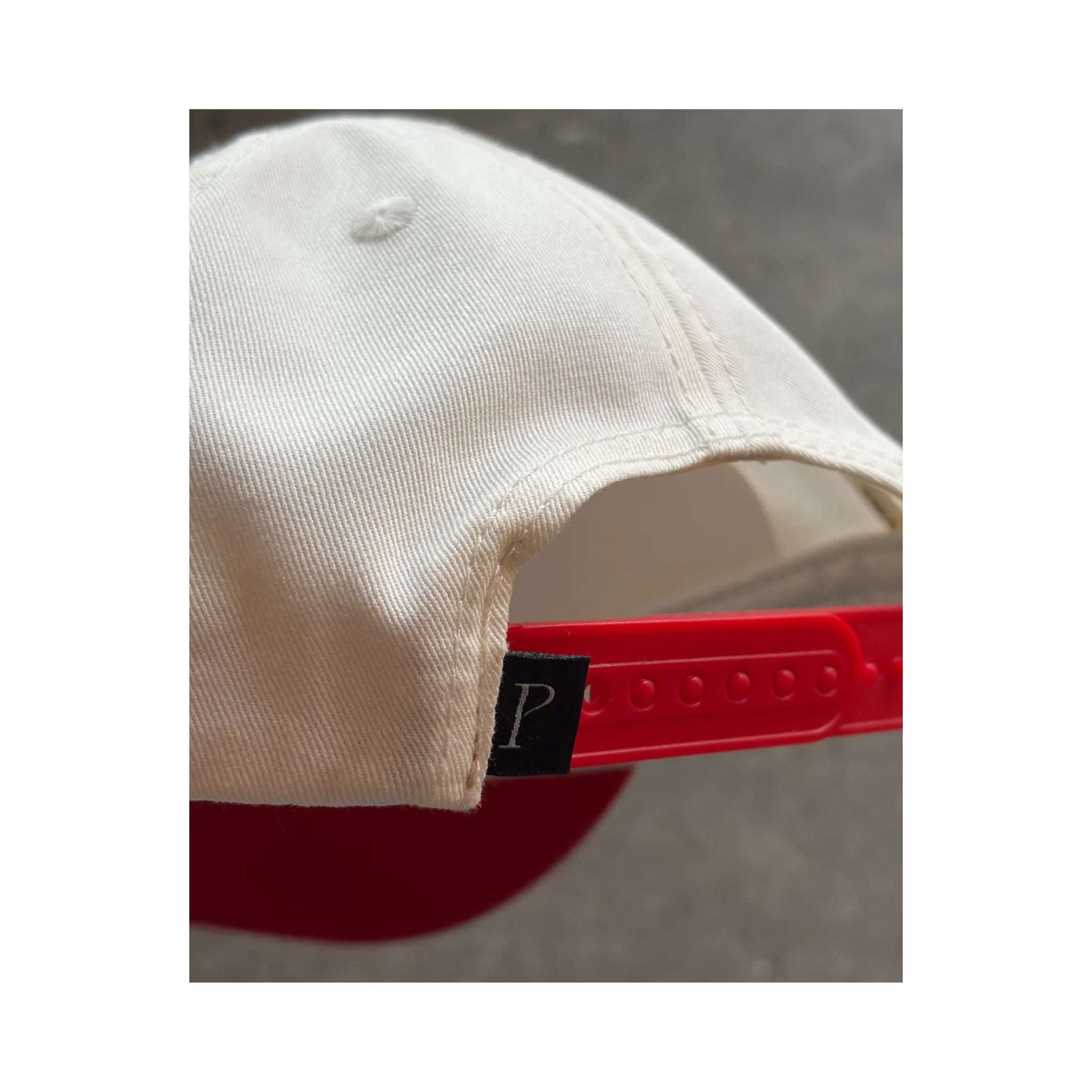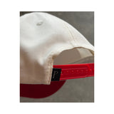 Gorra color blanca con rojo. Fit: Trucker de 5 páneles. Cierre de broches de presión.